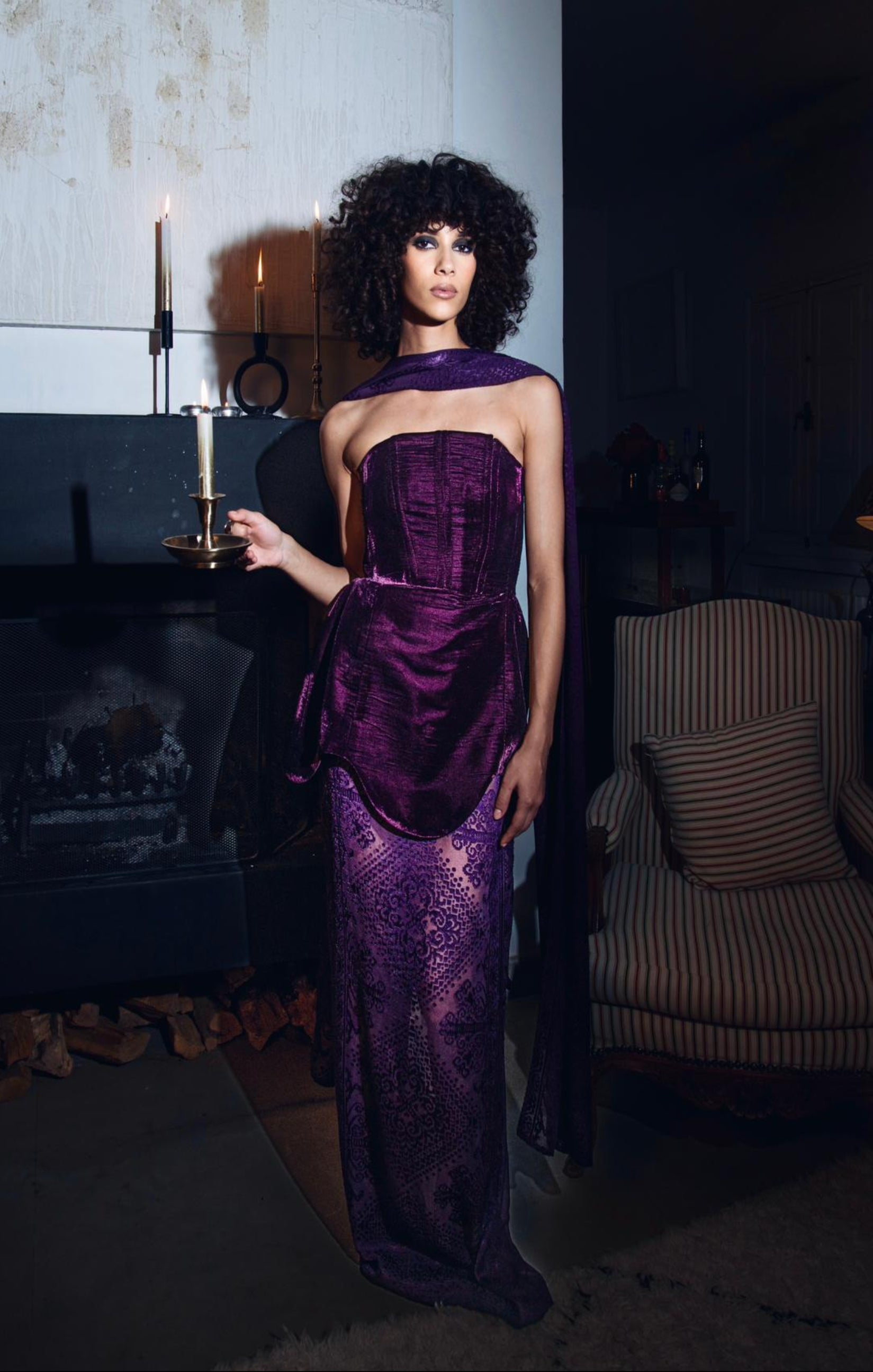 Corset long en velours violet foncé, accompagné d’une jupe et d’un châle en tlija de soie transparente.